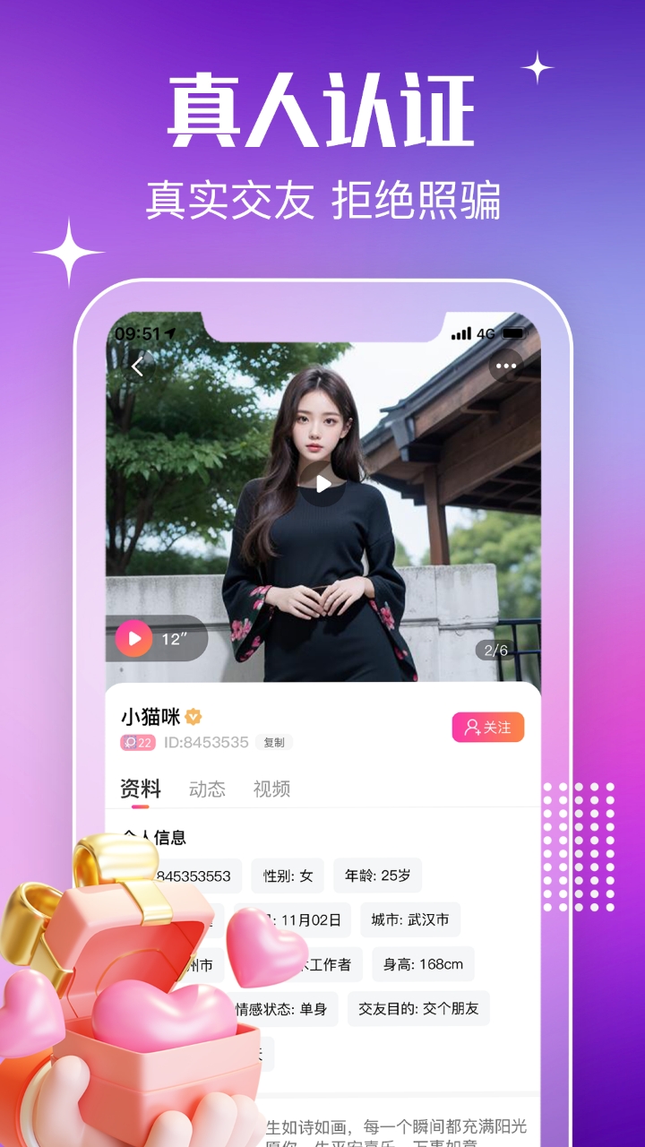 注重安全真实:通过真人认证,确保信息真实可靠,为用户营造安全的互动环境,让用户可以安心地与他人交流。